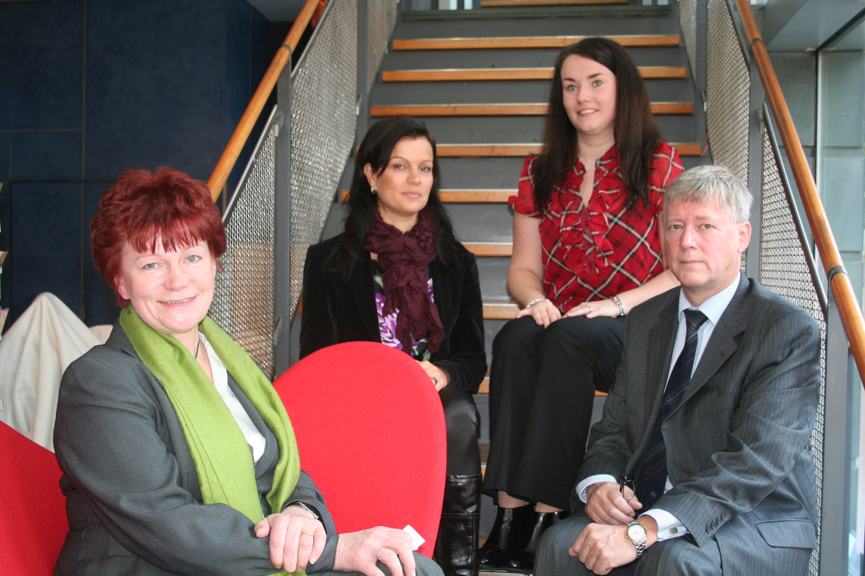 Riffa Hänninen, Head of SVT World, Eva Rasmussen, Customer Service Manager ConNova, Sofia Modin, Marketing SVT World, and Anders Nyberg, Senior Engineer, SVT Teknisk utveckling on the stairs at Scandinavia House, New York City. -