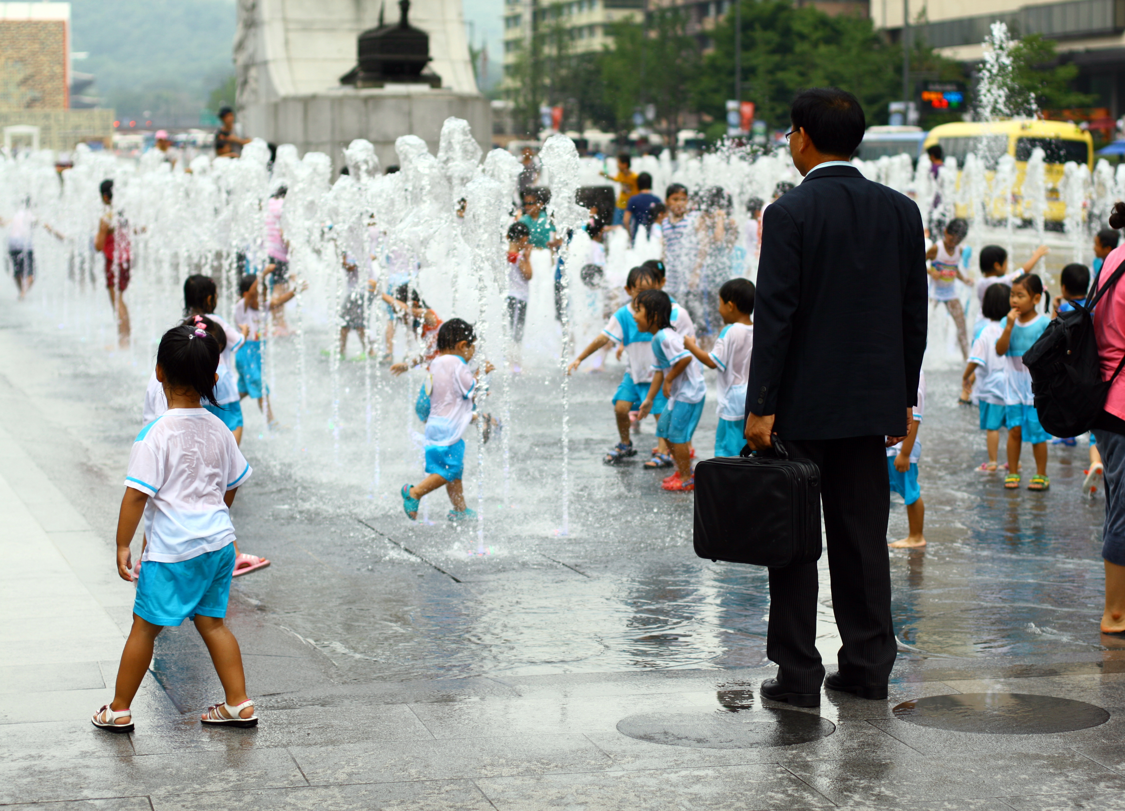 'Work and Play' "Taken in Seoul, South Korea and shows a businessman looking at the children playing in the fountain. I think it captures South Korean culture. Young children don’t have much worries but when school and work life starts there is a lot of pressure on you. South Koreans have one of the world’s longest working hours." Photo By: Erik Sellgren