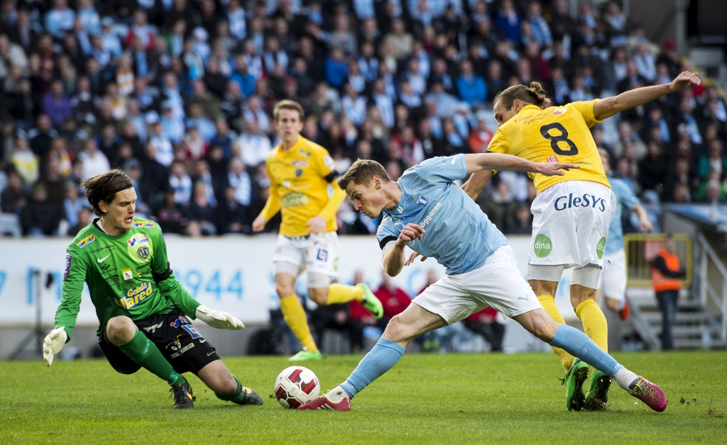 Malmö striker Markus Rosenberg tries to oush a shot past Falkenberg goalkeeper Otto Martler during MFF's 3-0 win March 30 at Swedbank Arena. Nils Jakobsson/Bildbyrån -
