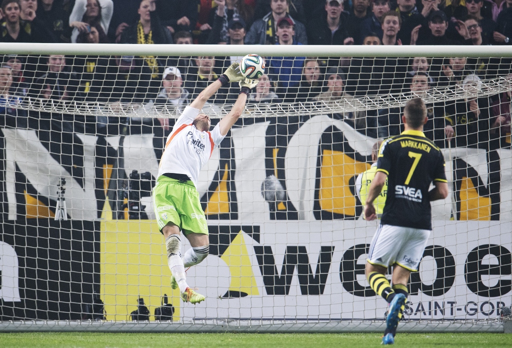 IFK Göteborg John Alvbåge makes a save to preserve the Angels' 2-0 win over AIK March 30 at Friends Arena. Joel Marklund/Bildbyrån -