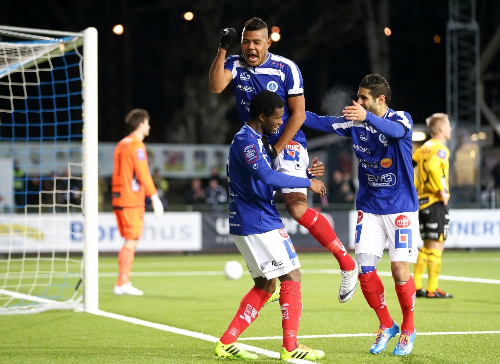 Ricardo Santos, Mohamed Abubakari and Imad Zatara celebrate after Mohamed Abubakari put Åtvidaberg up 2-0 in its 2-1 win over Elfsborg. Josefine Loftenius/Bildbyrån -